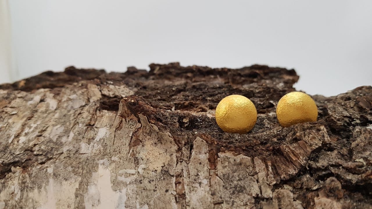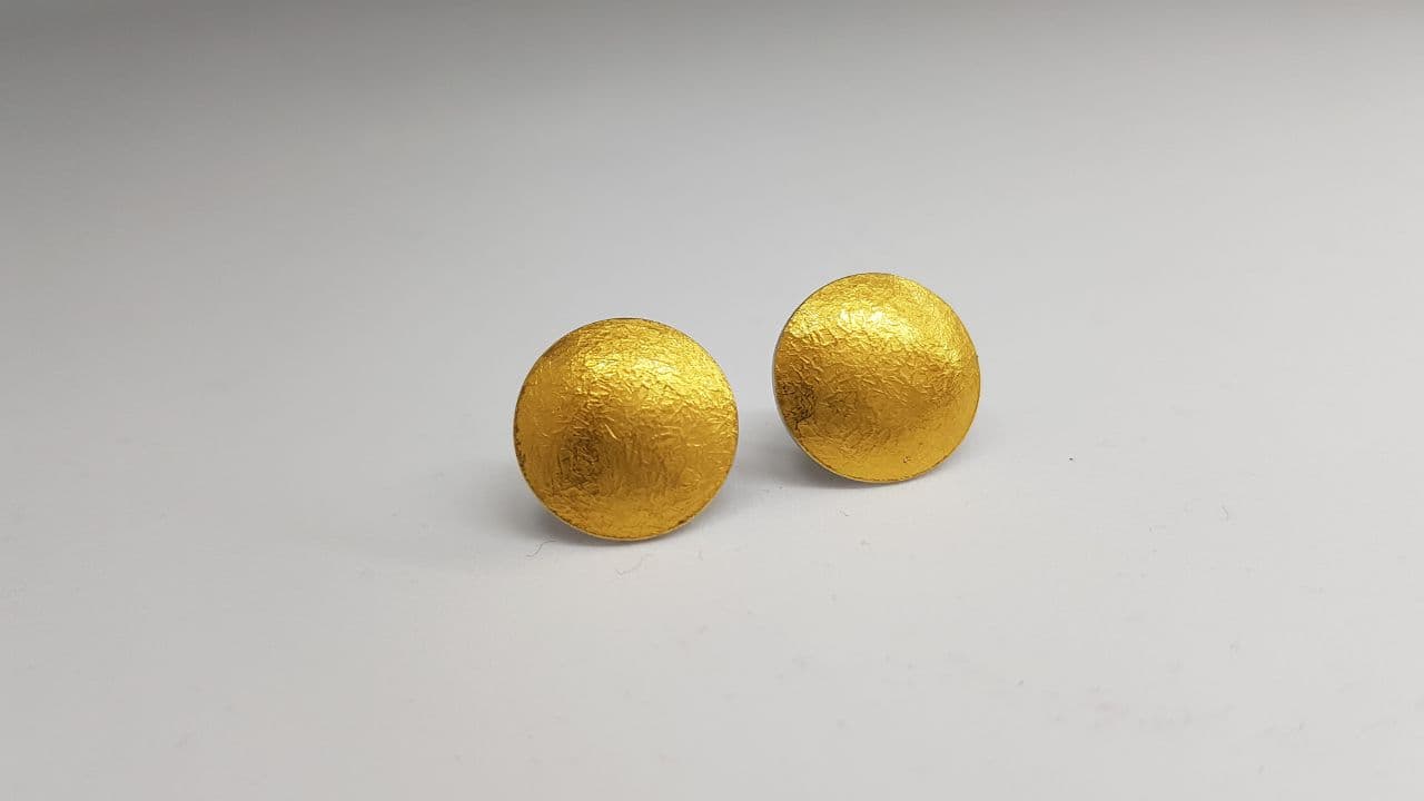 Die Ohrstecker sind aus Silber und mit Feingold plattiert. Durch ihren satten Goldfarbton sind sie gleichzeitig ein Hingucker, aber auch zu vielen Outfits passend. Der Hammerschlag gibt den Ohrsteckern eine besondere Art der Oberfläche, die etwas an das rohe Gold aus Flüssen erinnert. Mit einem 750/- Goldstift sind sie besonders verträglich. Eine individuelle Anfertigung in verschiedenen Durchmessern zwischen 3-14 mm nehme ich gerne vor. Auf Wunsch auch gerne mit matter oder polierter Oberfläche.